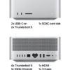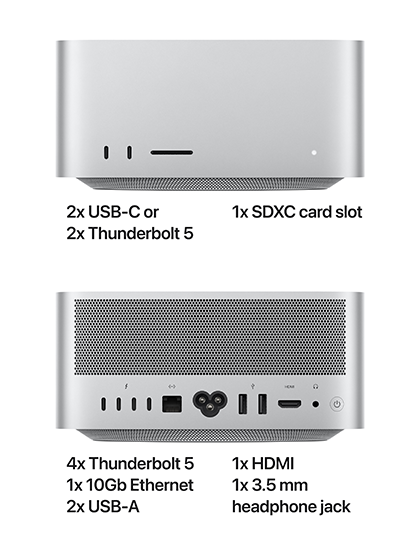 M4 Max: Includes four Thunderbolt 5 ports (up to 120 Gbps), two USB-A ports, HDMI 2.1, 10Gb Ethernet, a headphone jack, two USB-C ports on the front, and an SDXC card slot.