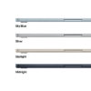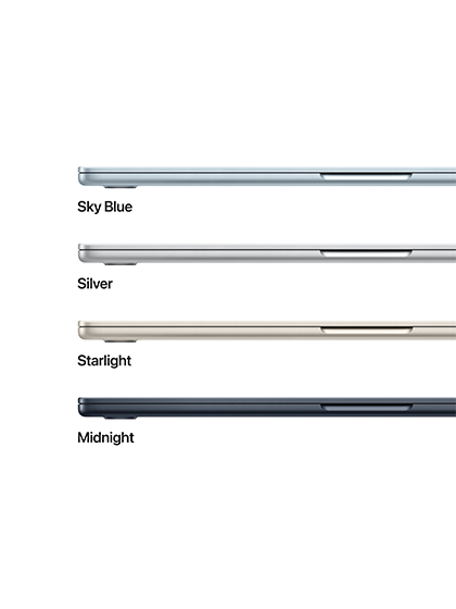 Design & Display: Features a thin and light, fanless design, making it portable. Available in two sizes: 13-inch (34.46 cm) and 15-inch (38.91 cm) Liquid Retina displays with True Tone technology. The display offers a 2560×1664 resolution at 224 pixels per inch and 500 nits brightness. A new Sky Blue color option is available, along with Midnight, Starlight, and Silver.